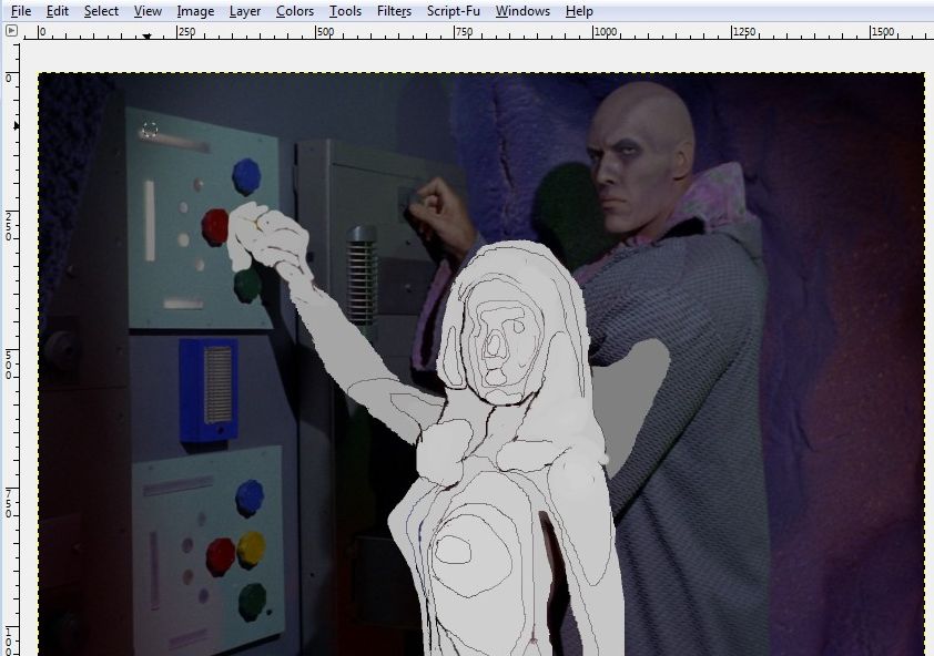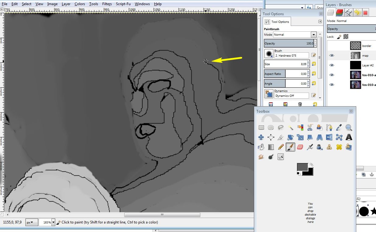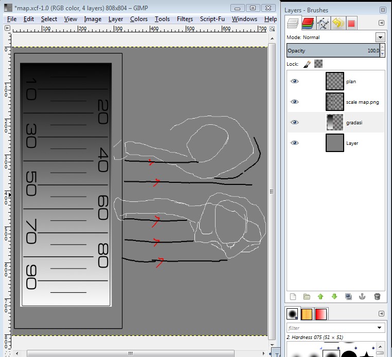 Catatan: Pastikan agar setiap garis kontur adalah kurva tertutup. Ini akan memudahkan nantinya  ketika mengisi warna keabuan dengan memakai ‘bucket fill tool’ pada GIMP.  Pembuatan garis kontur ini ditaruh pada layer tersendiri.