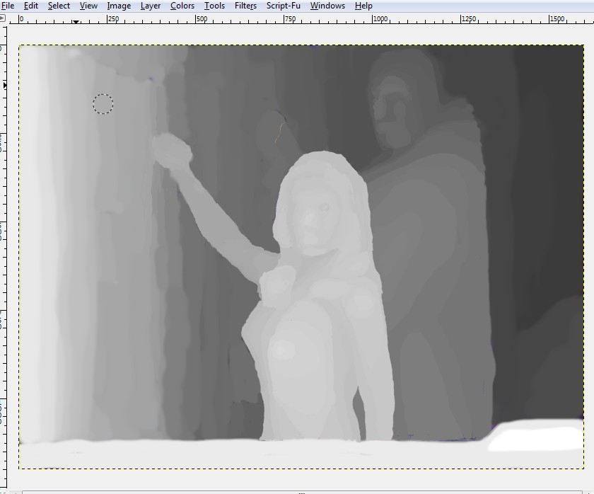 Akhirnya, peta kedalaman dari gambar 2D telah selesai. Perhatikan bahwa objek yang lebih dalam (menjauh) terlihat lebih gelap. Peta kedalaman ini akan digunakan oleh aplikasi GIMP untuk menggeser piksel. Cara menggeser piksel dapat dilihat di link artikel ini Mengubah foto 2D menjadi 3D.