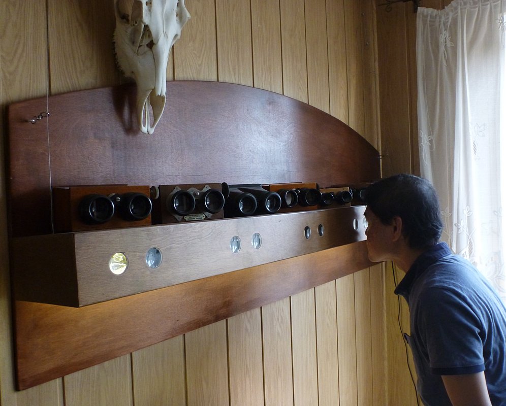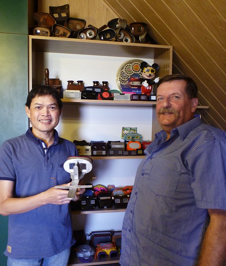 yang hitam adalah ‘roll royce’-nya view master, sangat presisi dan akurat. sehingga gambar sangat jernih dan ‘nyaman’ di mata, plus dilengkapi dengan battery dan lampu di dalamnya sehingga menjadi berat tetapi tidak perlu lagi mengarahkan ke cahaya untuk melihat gambar, bandingkan dengan produksi sekarang (warna biru) dari plastik yang ringkih dan hasil gambar 3Dnya tidak presisi kadang membuat pusingkoleksi viewer kuno (di atas rak) dan beberapa jenis dan versi view masterkoleksi foto-foto 3D lama dan bersejarahview master ‘bersuara’ sehingga setiap slide 3D yang kita lihat akan memberikan penjelasan dengan narator, lihat pita/bar hitam di tengah cakram view master penasaran juga bagaimana cara kerjanya, asumsi saya seperti pita magnetic (cassette)