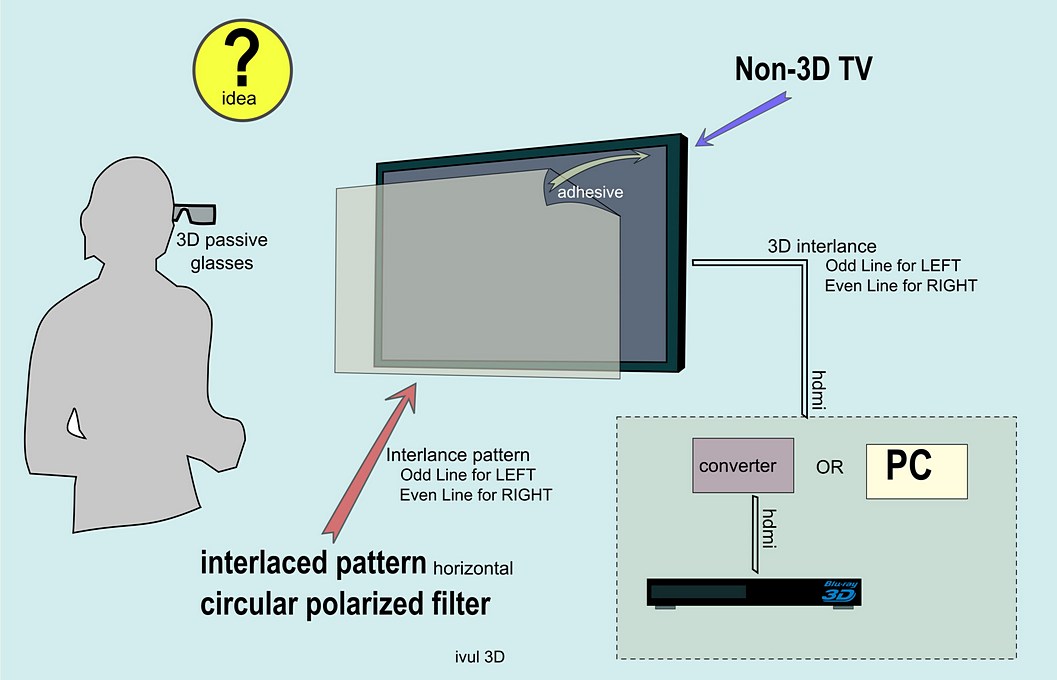 Just stick the filter on TV screen, provide TV input with a video 3D interlance information (odd line LEFT, even line RIGHT or other way)