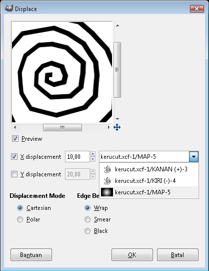 Pastikan layer Spiral_KANAN dalam posisi aktif. Ketika memilih Displace, akan keluar window pengaturan yang digeser hanya sumbu X, jadi jangan dicentang yang sumbu y. Pilih nilai 10px, nilai bisa tergantung besarnya gambar. untuk gambar dilihat di layar komputer atau gambar dari 600px X 800px, pergeseran 3px atau 6px sudah cukup terlihat. Pastikan layar berisi Map yang dipilih pada window pengaturan displace tool, pencet OK.